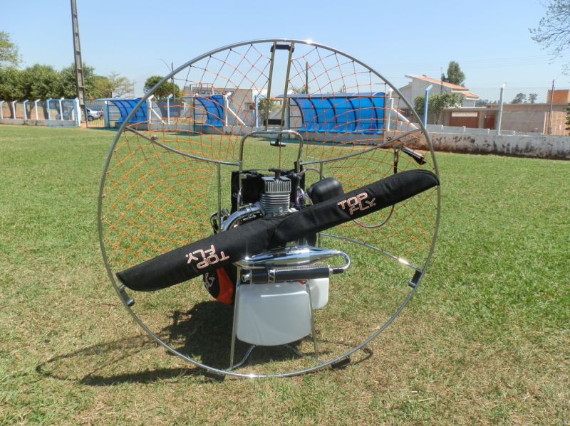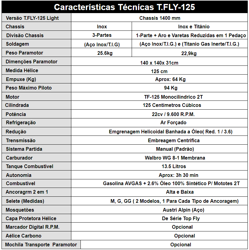 - Opçao 1ª T.FLY-125: Paramotor com estrutura completa em aço inox, dividido em 3 partes, com sistema de conexões (travas rápidas) e com um peso total de 25.6kg.